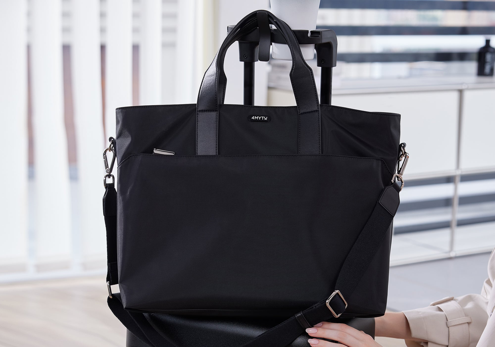 Start your day with ease and style using the 4MYTU Bag. Its water-resistant nylon ensures protection, while the leather trim adds a touch of sophistication. Featuring a padded laptop pocket, organized compartments, and an exterior pocket for travel documents, it attaches seamlessly to your luggage, offering both convenience and elegance. Light and spacious, it keeps you organized on any journey.